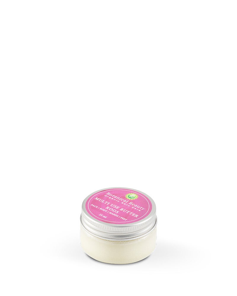 Multi Use Butter Roos is een product met zeer veel toepassingen. Gebruik ‘m als moisturizer voor body & face, voor droge plekjes, als highlighter, brow shaper of lipbalm